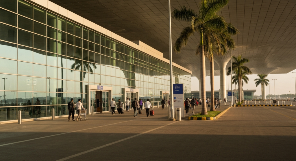 Reach at least 2 hours before domestic flights and 3 hours before international departures. Peak morning slots on Delhi and Mumbai flights can see long security queues, so give yourself a buffer during business travel hours.